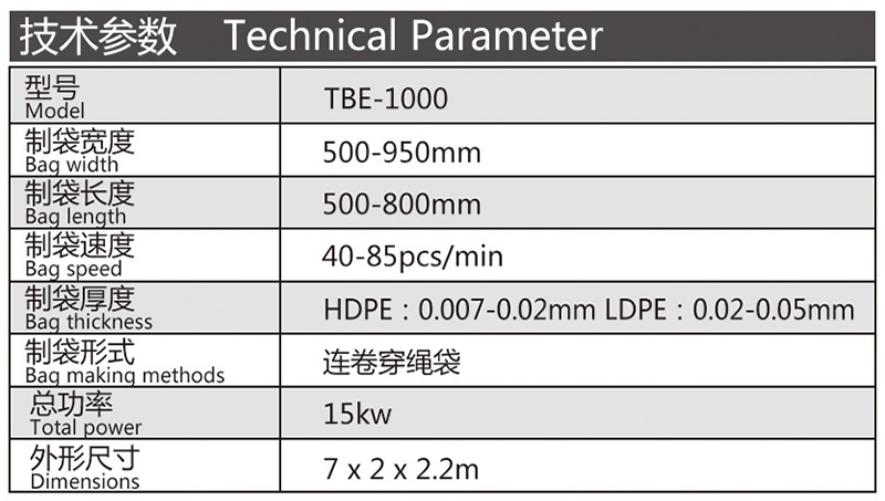 機器特性 此設備為生產連卷穿繩袋的專用設備,制袋速度快,調節簡單。此設備采用全鋼板一體而成,用電220v照明電即可。