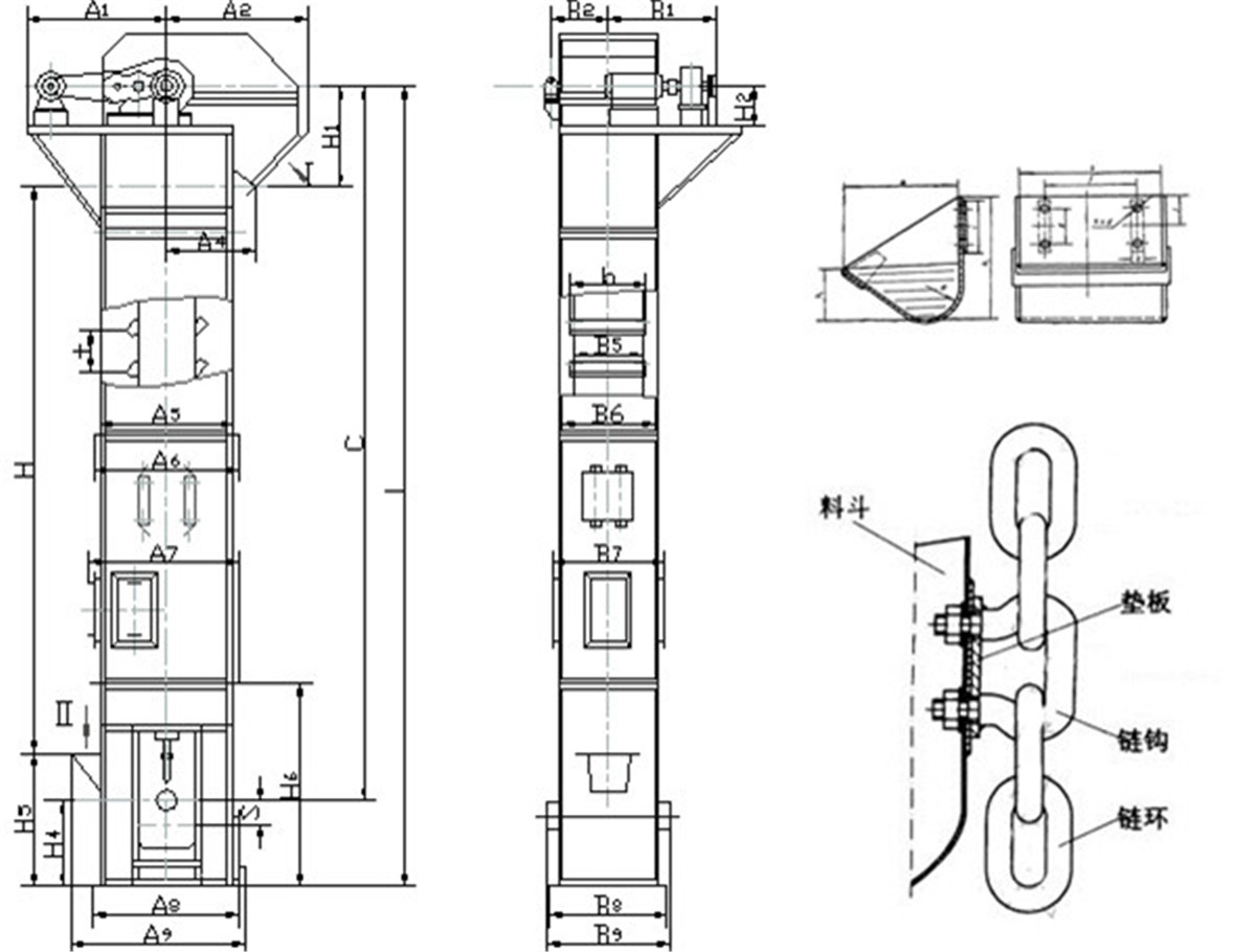 環(huán)鏈斗式提升機(jī)由運(yùn)動(dòng)部分(料斗與牽引鏈條)、帶有傳動(dòng)鏈輪的上部區(qū)段、帶有拉緊輪的下部區(qū)段、中間機(jī)殼、驅(qū)動(dòng)裝置、逆止制動(dòng)裝置等組成。本提升機(jī)的料斗為間斷式布置,利用“掏取法”進(jìn)行裝載,“離心投料法”卸料。本斗式提升機(jī)的牽引機(jī)構(gòu)是兩根環(huán)形鏈條.我公司生產(chǎn)的環(huán)鏈斗式提升機(jī),由運(yùn)動(dòng)部分(料斗與牽引鏈條)、帶有傳動(dòng)鏈輪的上部區(qū)段、帶有拉緊輪的下部區(qū)段、中間機(jī)殼、驅(qū)動(dòng)裝置、逆止制動(dòng)裝置等組成。本提升機(jī)的料斗為間斷式布置,利用“掏取法”進(jìn)行裝載,“離心投料法”卸料。本斗式提升機(jī)的牽引機(jī)構(gòu)是兩根環(huán)形鏈條。